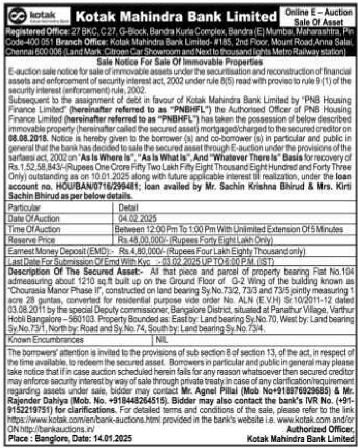 | Schedule of Property: | Description Of The Secured Asset- All that piece and parcel of property bearing Flat No 104 admeasuring about 1210 Sq ft built up on the Ground Floor of G-2 Wing of the building known as "Chourasia Manor Phase ii, constructed on land bearing Sy No 73/2, 73/3, and 73/5 jointly measuring 1 acre 28 guntas, converted for residential purpose vide order No ALN (E.V.H) Sr 10/2011-12 Dated 03.08.2011 by the special Deputy commissioner, Bangalore District, situated at Panathur Village, Varthur Hobli Bangalore-560103. Property Bounded as: East by: Land bearing Sy. No 70, West by: Land bearing Sy No 73/1, North by: Road and Sy. No. 74, South by: Land bearing Sy. No 73/4 |