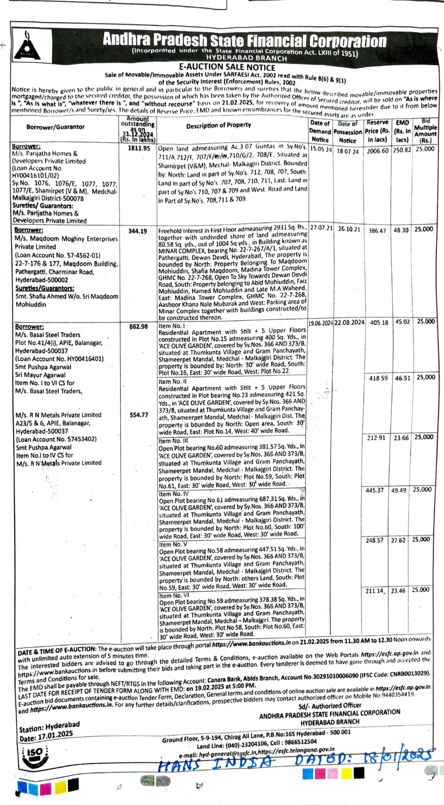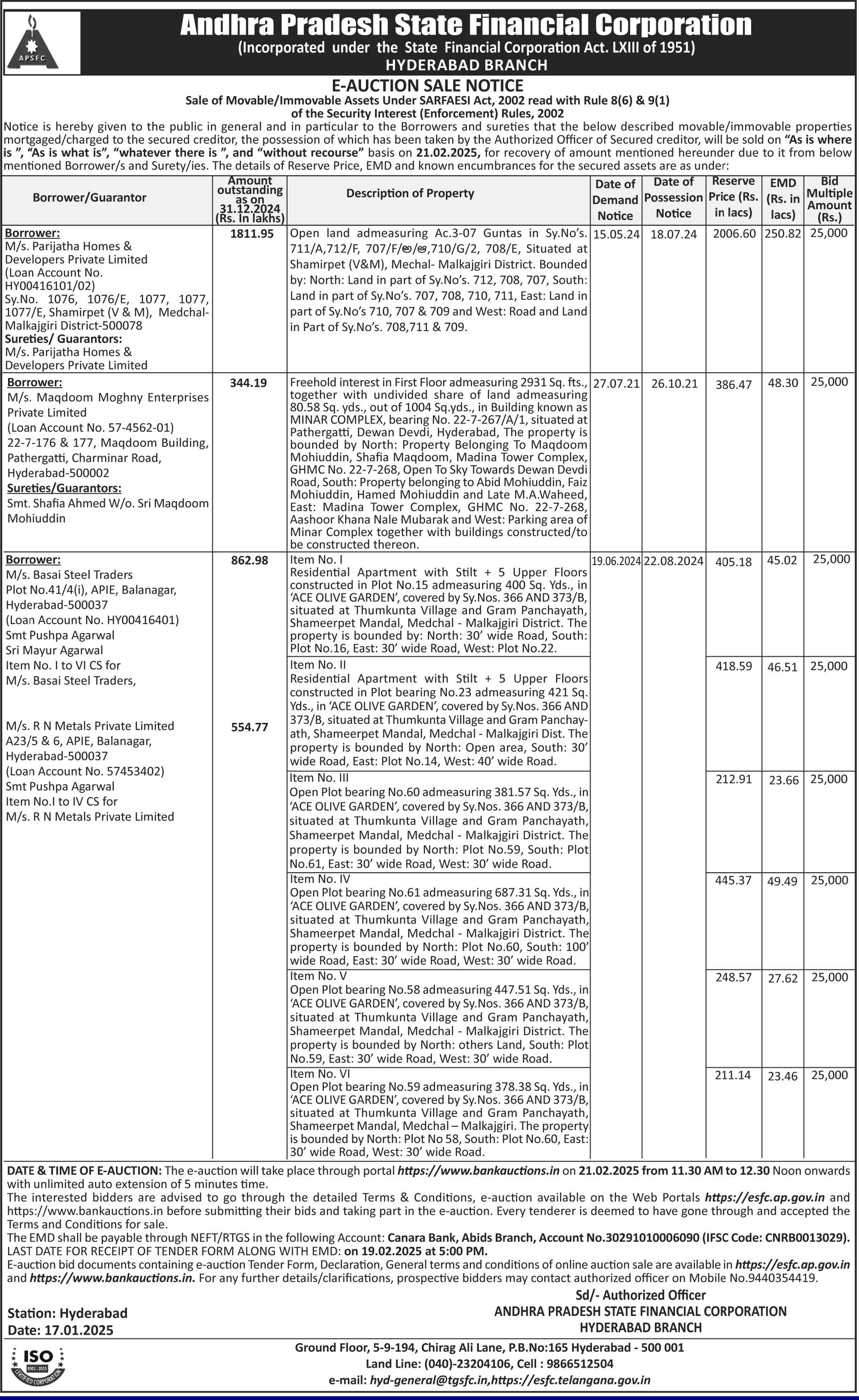 | End Date and Time of Auction: | 21-02-2025 12:30 pm |