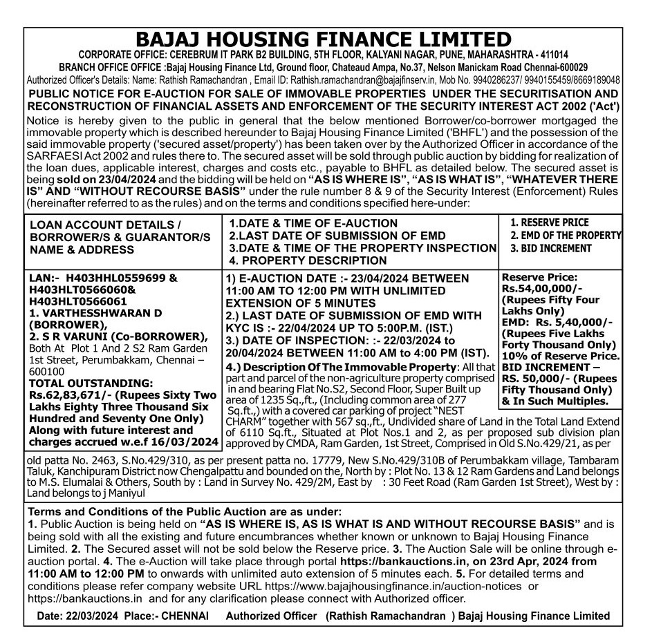 | Contact Details: | Contact Authorized Officer : Rathish Ramachandran , Mob.No.:9940286237 / 9940155459/ 8669189048 |