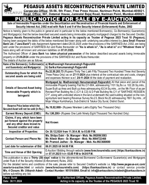 | Schedule of Property: | All that piece and parcel of the immovable Property bearing Flat No C/1-904, admeasuring 1101 Sq fts i.e. 102.28 mtrs., Super Built Area and Built up Area admeasuring 63.34 Sq.mtrs., on the 9th Floor of as per Revised Plan Building No.C (C/1 & C/2) & D Paiki Building No.C/1 of SARTHEE RESIDENCY along with undivided share in the land underneath the said building situated on the non-agriculture land bearing Revenue Survey No.23. Block No.20 admeasuring 7801 Sq.mtrs., of Moje Village Kumbhariya, Sub-District & Taluka City Surat, District Surat |