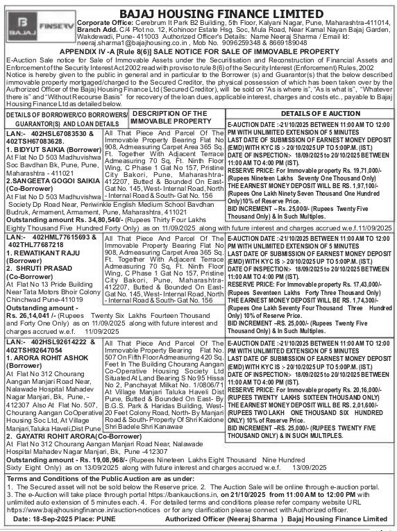 | Schedule of Property: | All That Piece And Parcel Of The Immovable Property Bearing Flat No 908, Admeasuring Carpet Area 365 Sq. Ft. Together With Adjacent Terrace Admeasuring 70 Sq. Ft. Ninth Floor Wing, C Phase 1 Gat No 157, Pristine City Bakori, Pune, Maharashtra-412207, Butted & Bounded On East-Gat No. 145, West-Internal Road, North -Internal Road & South-Gat No. 156 |