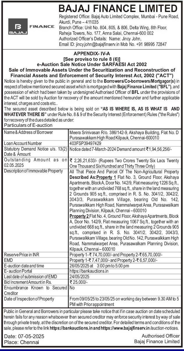| Schedule of Property: | Property 1 Flat No. 3, Ground Floor, Akshaya Apartments, BlockA, Door No. 142/9, Flat measuring 1226 Sq.ft., together with an undivided 768 sq.ft., share in the land measuring 2 Grounds 905 sq.ft., comprised in R. S. No. 3041/2, 3042/2, 3043/3, Puraswalkkam Village, bearing Old No. 142, Puraswalkkam High Road, Nammalwarpet Area, Purasawalkam Planning Division, Kilpauk, Chennai-600010 |