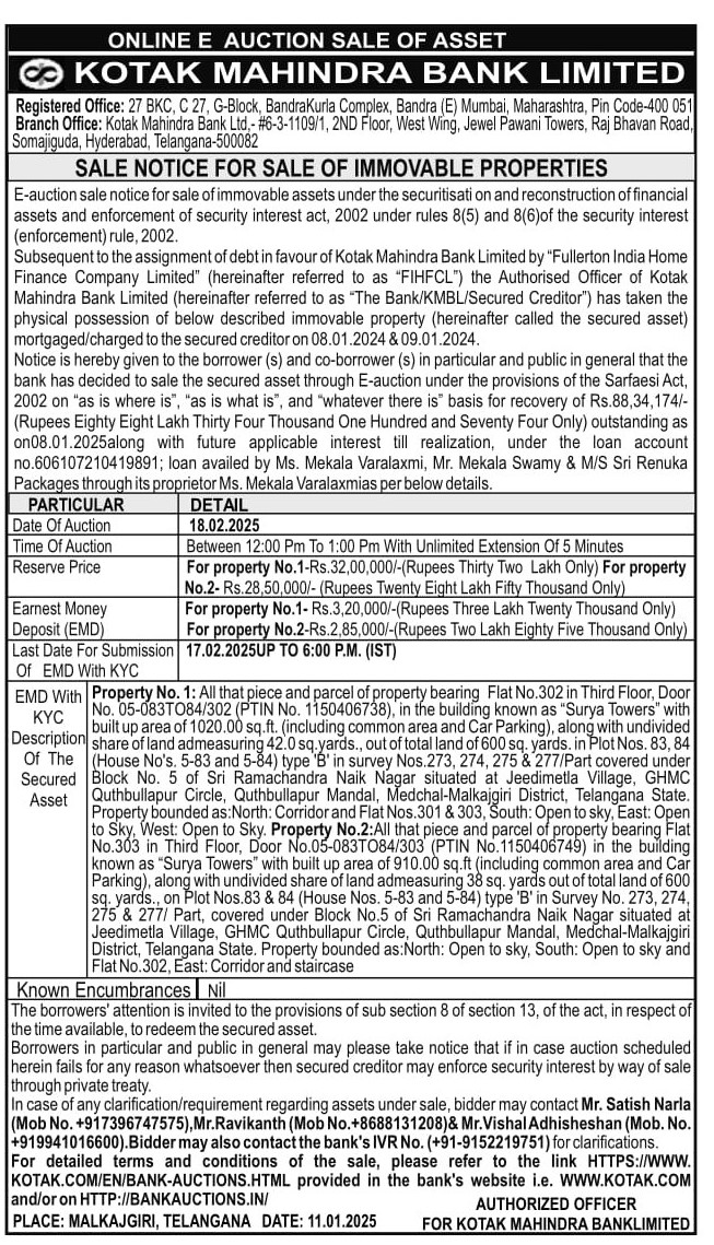 | Schedule of Property: | Property No. 1: All that piece and parcel of property bearing Flat No.302 in Third Floor, Door No. 05-083TO84/302 (PTIN No. 1150406738), in the building known as Surya Towers with builtup area of 1020.00 sq.ft. (including common area and Car Parking), along with undivided share of land admeasuring 42.0 yards., out of total land of 600 sq. yards. in Plot Nos. 83, 84 (House No's. 5-83 and 5-84) type B in survey Nos 273, 274, 275 & 277/Part covered under Block No. 5 of Sri Ramachandra Naik Nagar situated at Jeedimetla Village, GHMC Quthbullapur Circle, Quthbullapur Mandal, Medchal-Malkajgiri District, Telangana State. Property bounded as North: Corridor and Flat Nos. 301 & 303, South: Open to sky, East: Open to Sky, West: Open to Sky. |