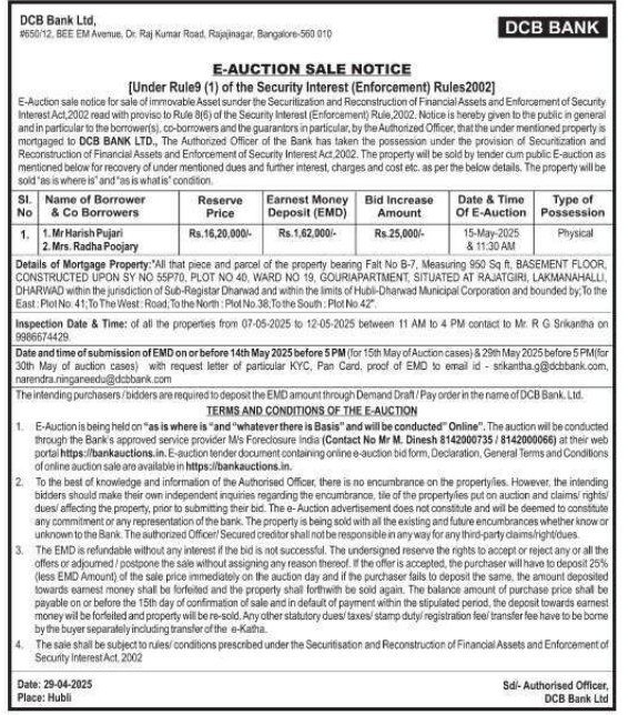 | Schedule of Property: | All that piece and parcel of the property bearing Flat No B-7, Measuring 950 Sq ft, BASEMENT FLOOR CONSTRUCTED UPON SY NO 55P70. PLOT NO 40. WARD NO 19. GOURIAPARTMENT SITUATED AT RAJATGIRI, LAKMANAHALLI DHARWAD within the jurisdiction of Sub-Registar Dharwad and within the limits of Hubli-Dharwad Municipal Corporation and bounded by: To the East: Plot No 41 To The West Road, To the North Plot No 38 To the South: Plot No 42" |