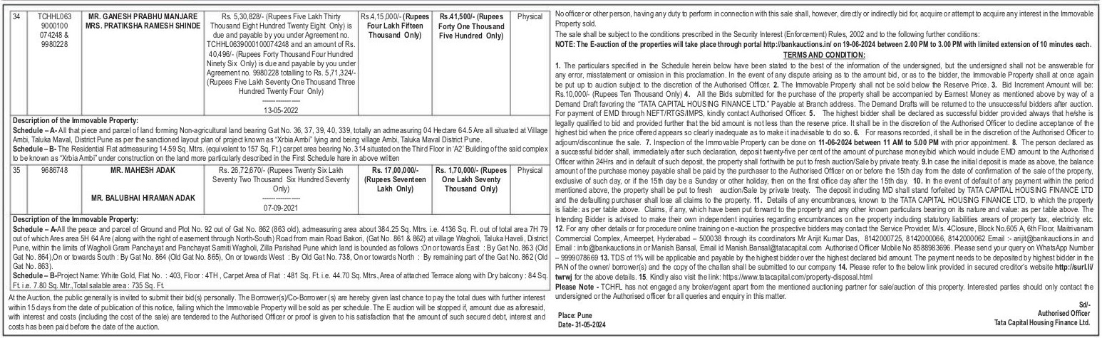 | Contact Details: | Contact The Authorized Officer : Rohin Todiwala 8758377222, Sunil Sharma 9960796000, Manish Bansal 8588983696, 9999078669 |