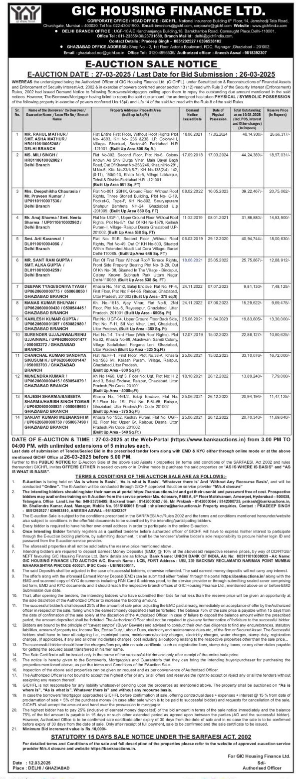 | Schedule of Property: | Kh. No.-1515. Ajay Vihar, Flat No-5. 2Nd Floor, Plot No.-6. Rayeespur, Ghaziabad, Uttar Pradesh, 201001 (Built Up Area - 6505q. Ft) |