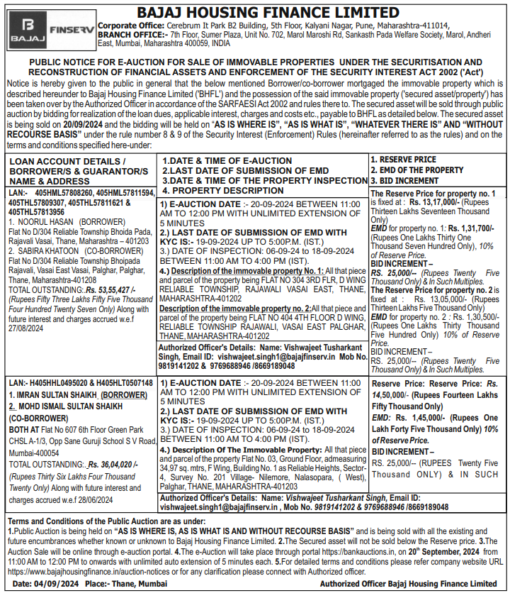 | Contact Details: | Contact The Authorized Officer: Vishwajeet Tusharkant Singh, Email ID: vishwajeet.singh1@bajajfinserv.in, Mob No. 9819141202 & 9769688946/8669189048 |