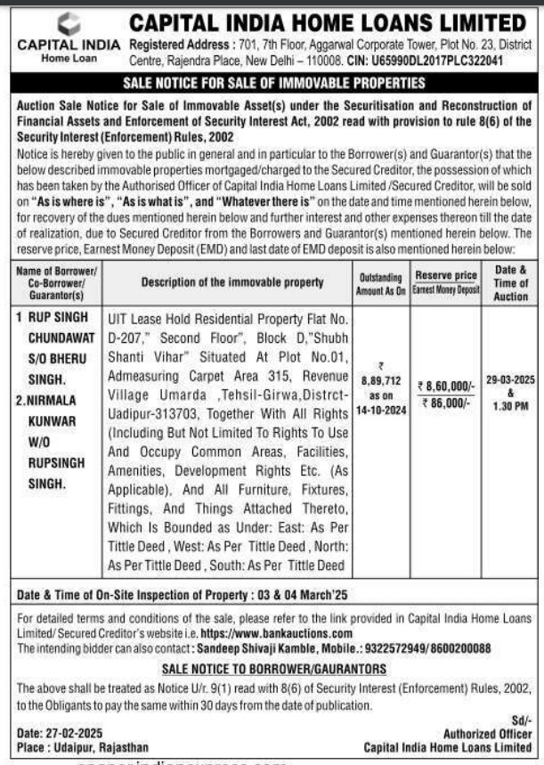 | Schedule of Property: | UIT Lease Hold Residential Property Flat No. D-207," Second Floor, Block D,"Shubh Shanti Vihar Situated At Plot No.01, Admeasuring Carpet Area 315, Revenue Village Umarda, Tehsil-Girwa, Distrct-Udaipur-313703, Together With All Rights (Including But Not Limited To Rights To Use And Occupy Common Areas, Facilities, Amenities, Development Rights Etc. (As Applicable). And All Furniture, Fixtures, Fittings, And Things Attached Thereto, Which Is Bounded as Under: East: As Per Tittle Deed, West: As Per Tittle Deed, North: As Per Tittle Deed, South: As Per Tittle Deed |