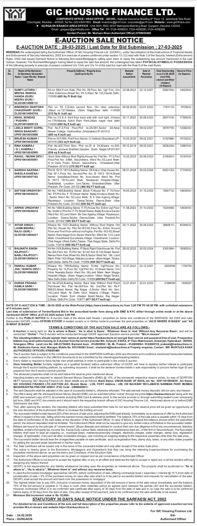 | Contact Details: | Contact The Authorized Officer: MR MURTUZA KHAN - 8769054480 |