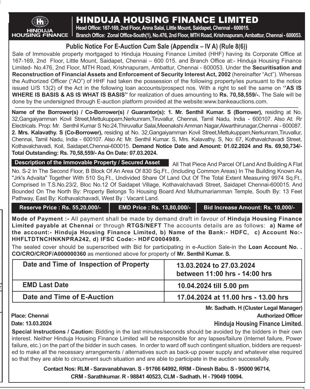 | Contact Details: | Contact The Authorized Officer : RLM - Saravanabhavan. S - 91766 64992, RRM - Dinesh Babu. S 95000 96714, CRM - Sarathkumar. R - 98841 40523, CLM - Sadhath. H - 79049 10094. |