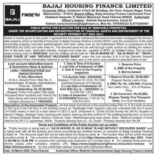 | Contact Details: | Contact The Authorized Officer: Rathish Ramachandran, Email ID: Rathish.ramachandran@bajajfinserv.in , 9791005322 & 8778385461 |