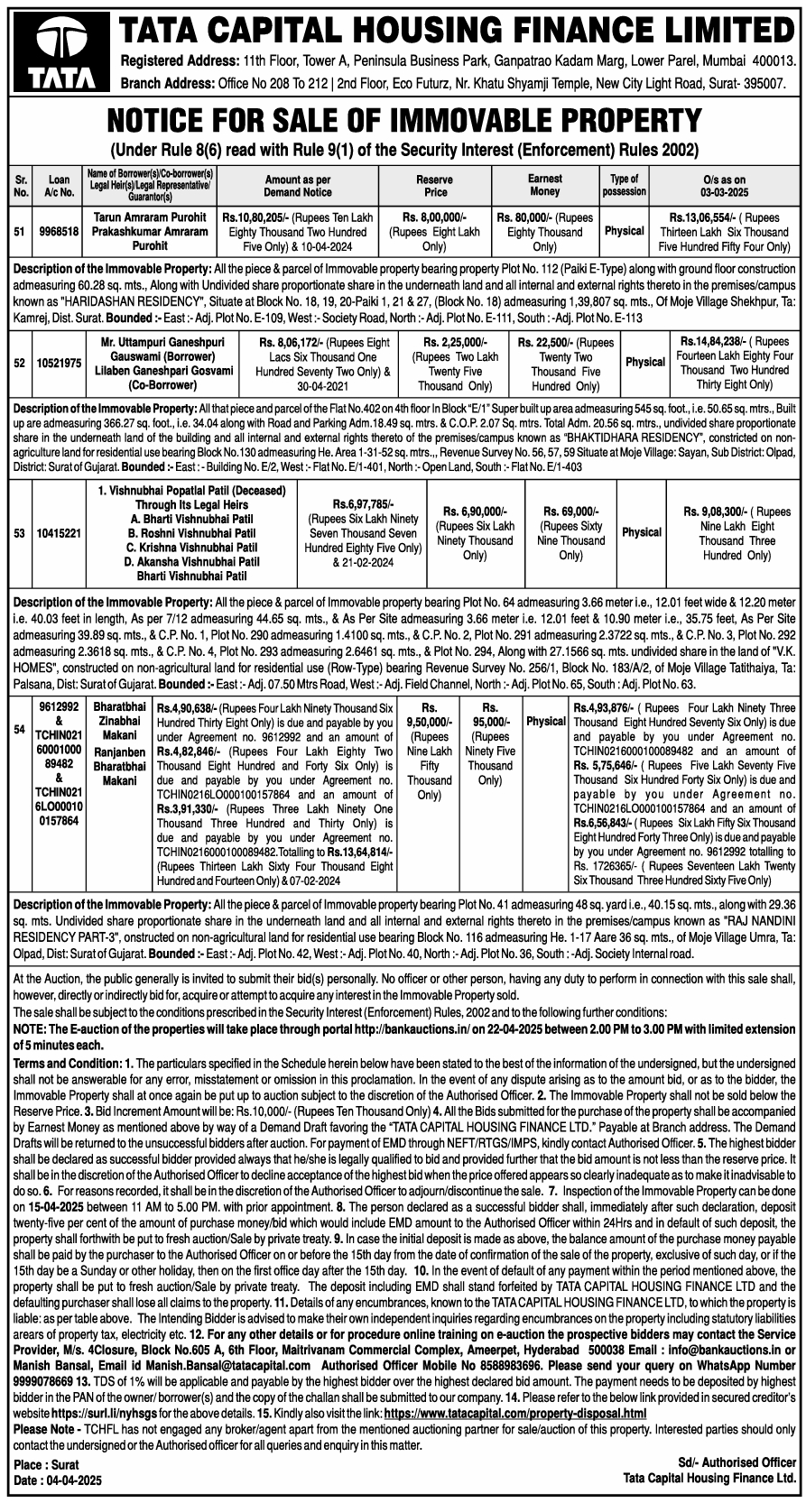 | Contact Details: | Contact The Authorized Officer: Manish Bansal, Email id Manish.Bansal@tatacapital.com 8588983696. WhatsApp Number 9999078669 |
