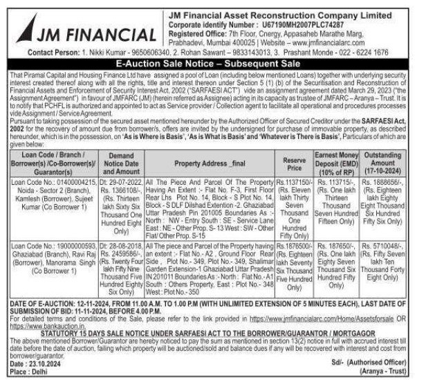 | Contact Details: | Contact The Authorized Officer : Nikki Kumar - 9650606340 , Rohan Sawant - 9833143013 ,Prashant Monde - 022 - 6224 1676 |