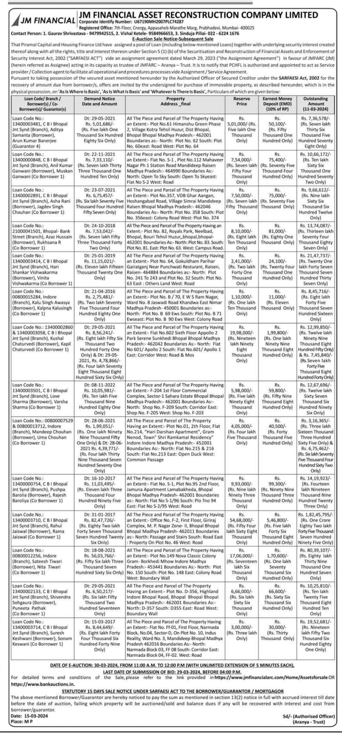 | Start Date and Time of Auction: | 30-03-2024 11:00 am |