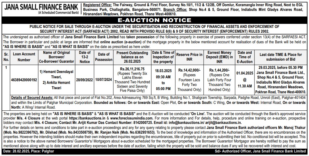 | Schedule of Property: | All that piece and parcel of Flat No.202, Area Admeasuring 769 Sq.ft, B Wing, Building No.1, Shaligram Township, Sarpada, Padghe Road, Umroli (East), Palghar-401404 and within the Limits of Palghar Municipal Corporation. Bounded as follows: On or towards East: Open Plot, On or towards South: C Wing, On or towards West: Internal Road, On or towards North: A Wing/ Internal Road. |