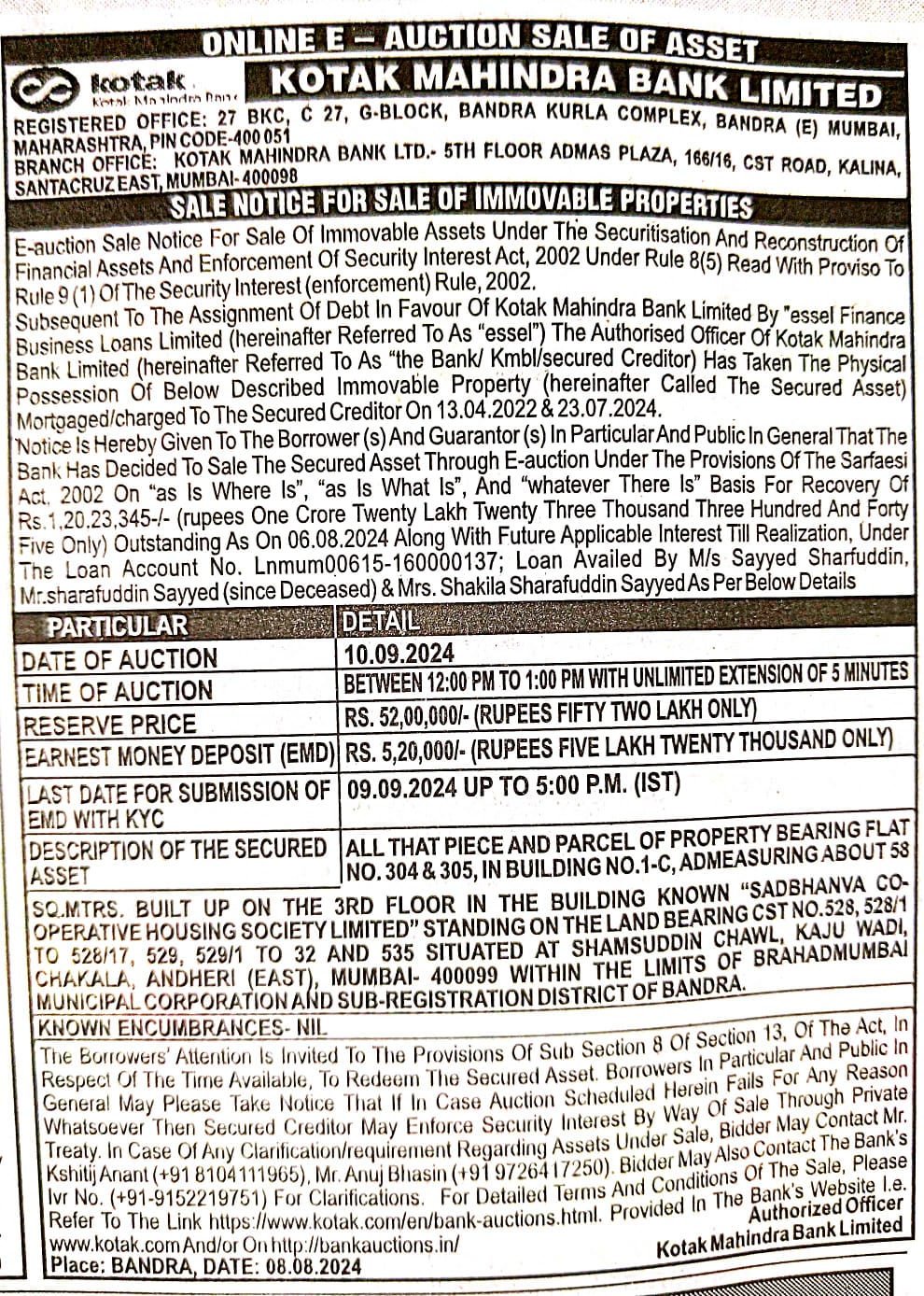 | Schedule of Property: | ALL THAT PIECE AND PARCEL OF PROPERTY BEARING FLAT NO. 304 & 305, IN BUILDING NO. 1-C, ADMEASURING ABOUT 58 SQ.MTRS. BUILT UP ON THE 3RD FLOOR IN THE BUILDING KNOWN "SADBHANVA CO- OPERATIVE HOUSING SOCIETY LIMITED" STANDING ON THE LAND BEARING CST NO.528, 528/1 TO 528/17, 529, 529/1 TO 32 AND 535 SITUATED AT SHAMSUDDIN CHAWL, KAJU WADI, CHAKALA ANDHERI (EAST), MUMBAI- 400099 WITHIN THE LIMITS OF BRAHAD MUMBAI MUNICIPAL CORPORATION AND SUB-REGISTRATION DISTRICT OF BANDRA. KNOWN ENCUMBRANCES NIL |