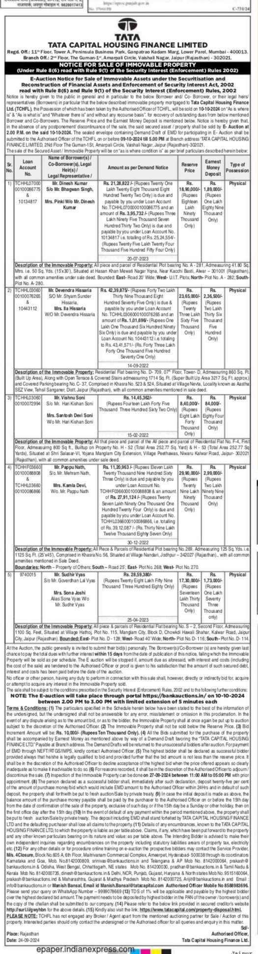 | Contact Details: | Contact The Authorized Officer: Manish Bansal: 8588983696/ 9999078669 Manish.Bansal@tatacapital.com |
