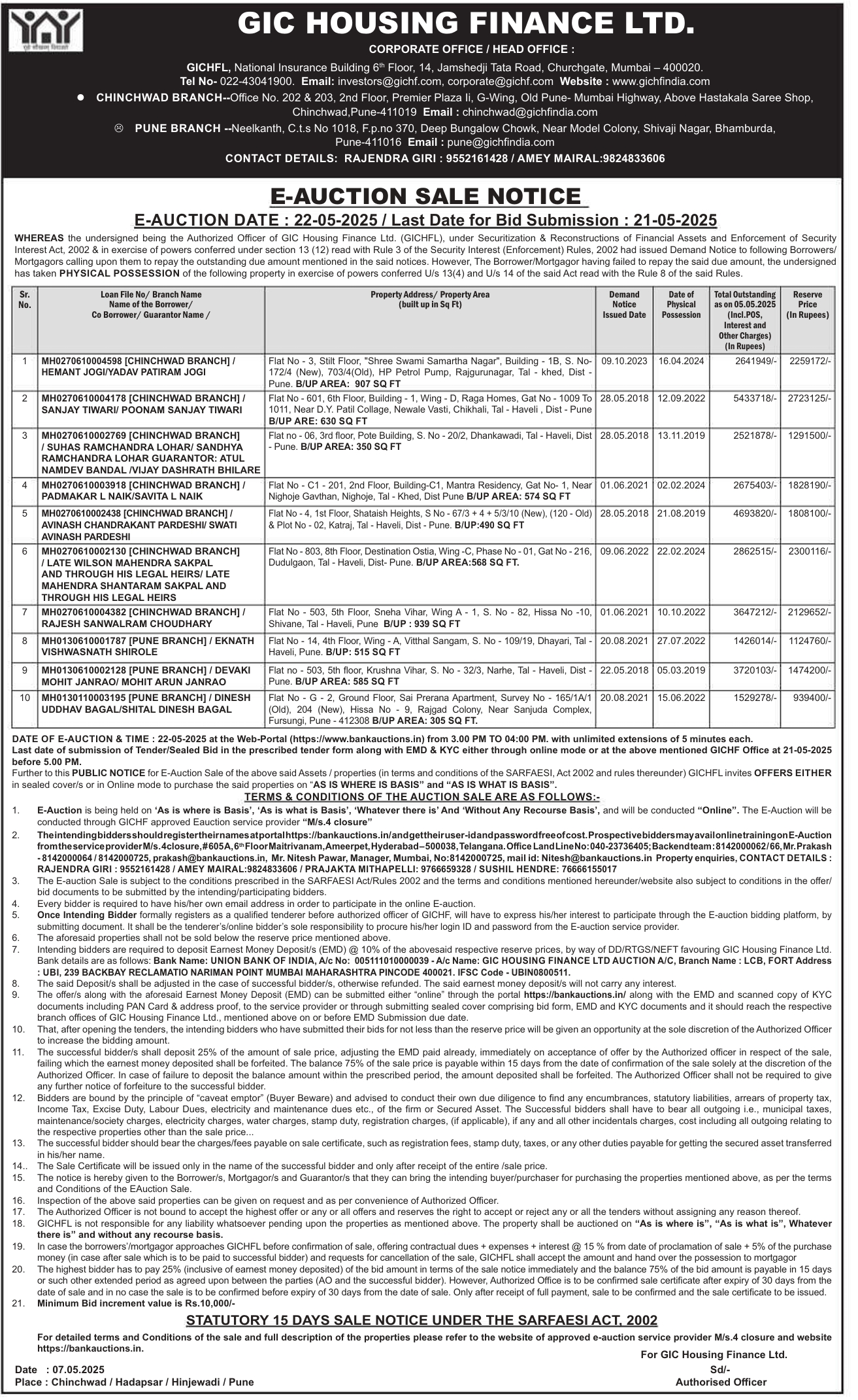 | Contact Details: | Contact The Authorized Officer: Rajendra Giri: 9552161428, Amey Mairal:9824833606 |