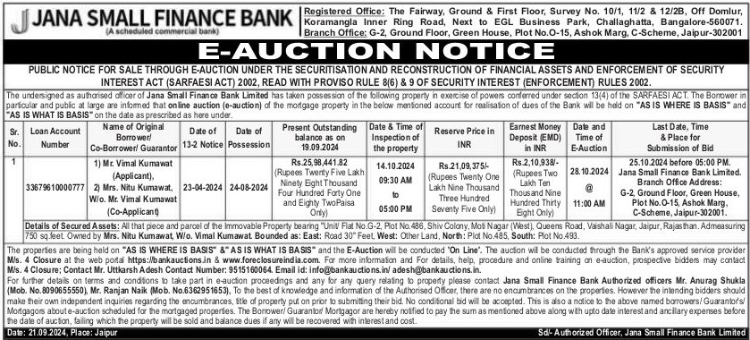 | Schedule of Property: | All that piece and parcel of the Immovable Property bearing Unit Flat No.G-2, Plot No. 486, Shiv Colony, Moti Nagar (West), Queens Road, Vaishali Nagar, Jaipur, Rajasthan. Admeasuring 750 sq.feet. Owned by Mrs. Nitu Kumawat, W/o. Vimal Kumawat. Bounded as: East: Road 30 Feet, West: Other Land, North: Plot No.485, South: Plot No.493. |