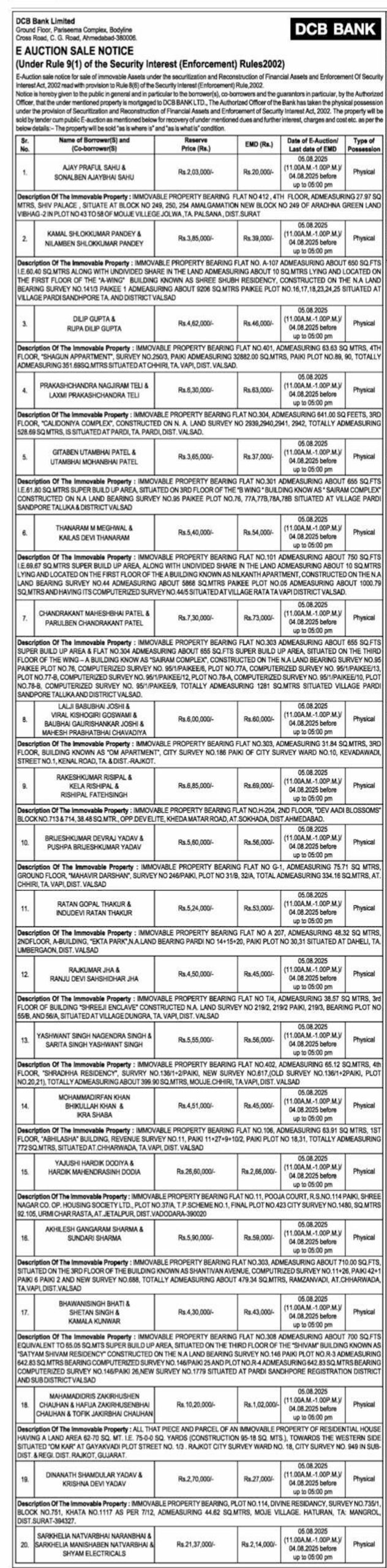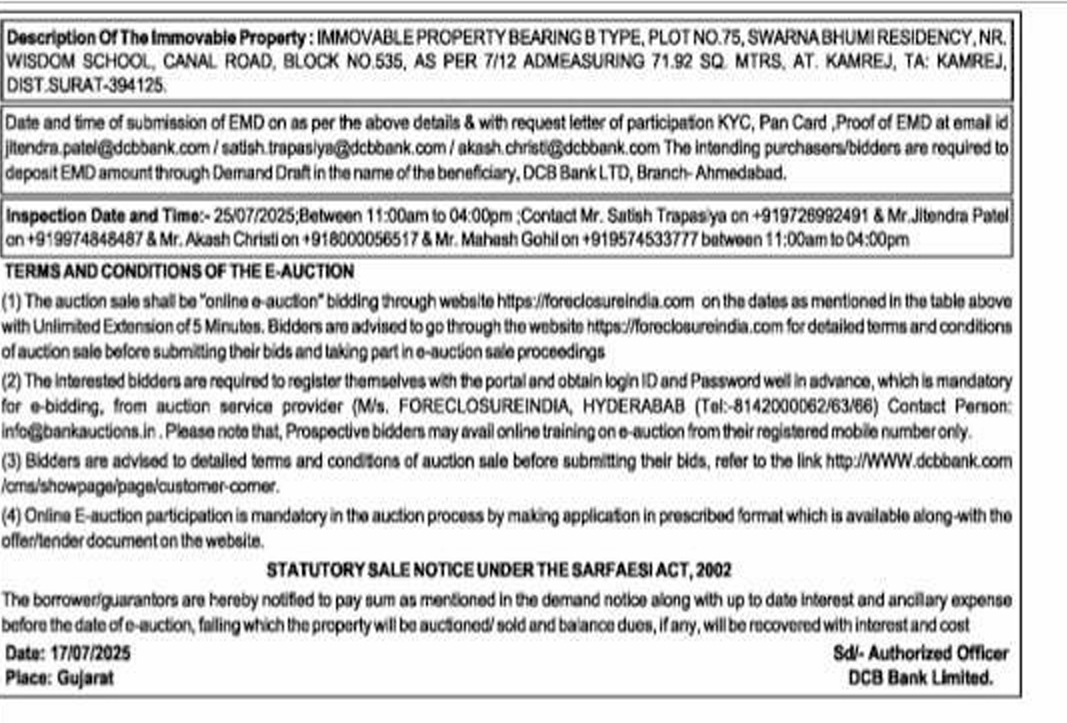 | Contact Details: | Contact The Authorized Officer : Mr. Satish Trapasiya on 919726992491 Mr. Jitendra Patel on 919974848487 Mr. Akash Christi on 918000056517 Mr. Mahash Gohil on 919574533777 |