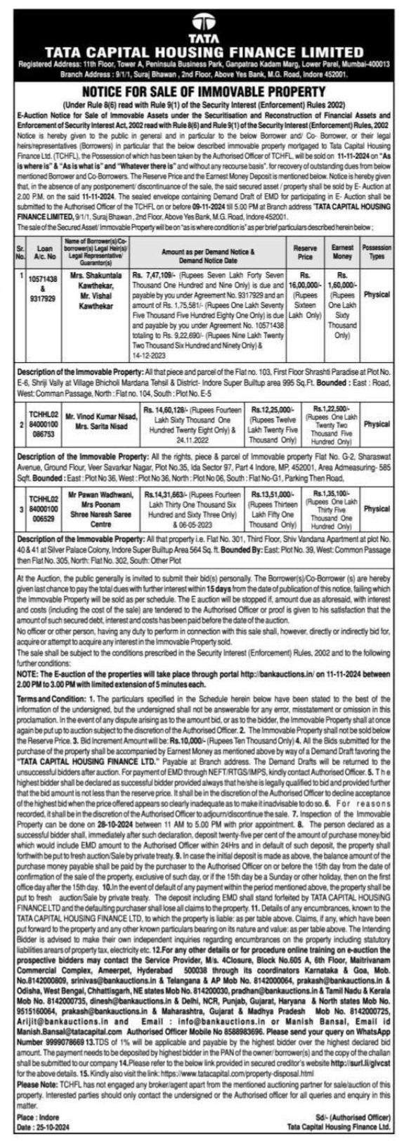 | Contact Details: | Contact The Authorized Officer : Manish Bansal, Email id Manish.Bansal@tatacapital.com , 8588983696 / 9999078669 |