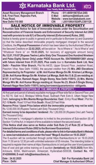 | Schedule of Property: | All that part and parcel of already equitable mortgage of Rear side flat on Second Floor, plot no RZ-15 Gali no-2, Bindapur Mithila Road, Subhash Park Extn-II. Uttam Nagar New Delhi, belonSging to Mrs Mamta Monga Boundaries: East: Entry/ Road West: Plot No RZ-16 North: Road 10 Feet Wide South Road 20 Feet Wide |