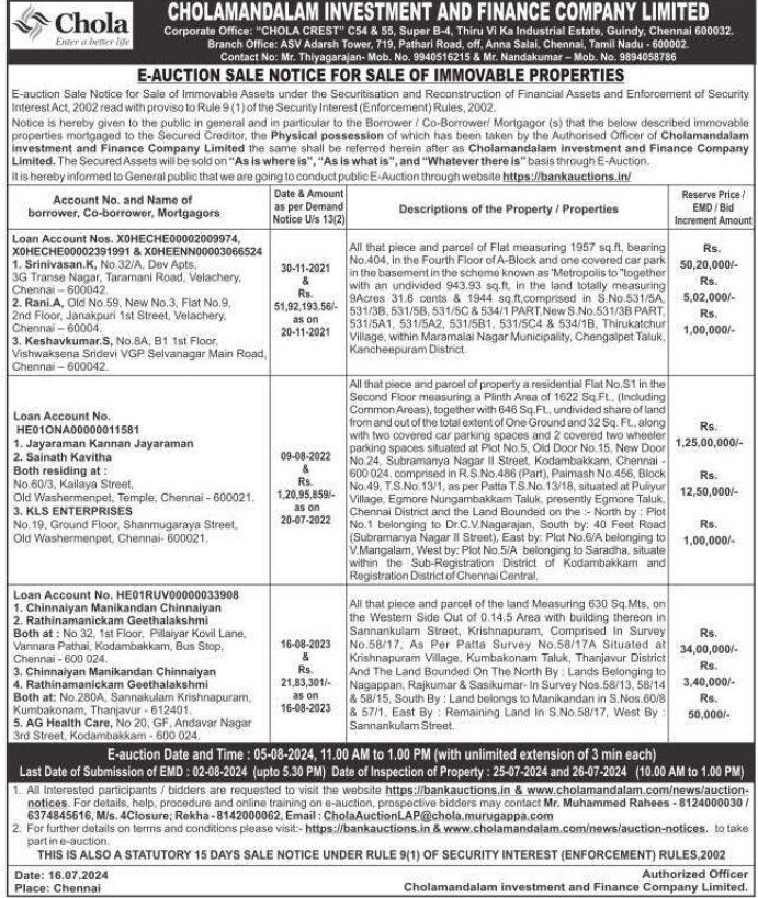 | Contact Details: | Contact The Authorized Officer: Mr. Thiyagarajan- Mob. No. 9940516215 & Mr. Nandakumar Mob. No. 9894058786, Mr. Muhammed Rahees . 8124000030 |