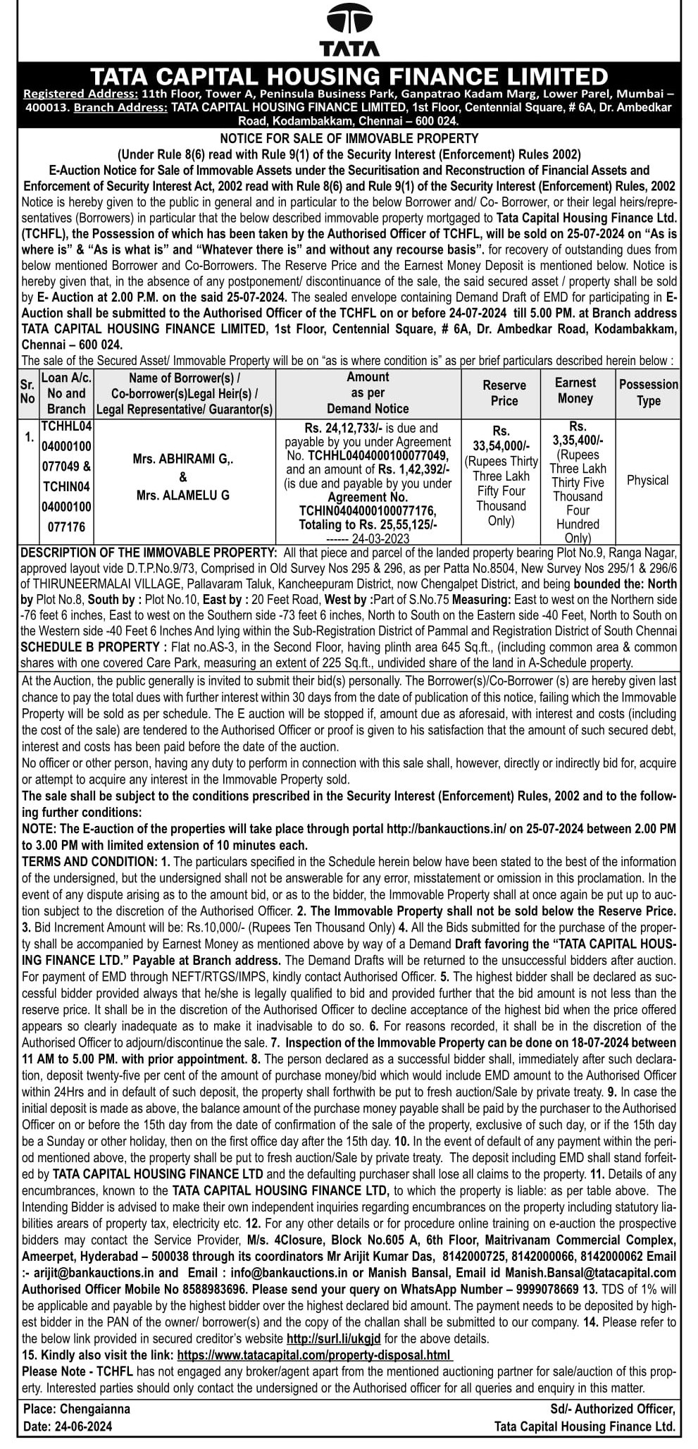 | Schedule of Property: | DESCRIPTION OF THE IMMOVABLE PROPERTY: All that piece and parcel of the landed property bearing Plot No.9, Ranga Nagar, approved layout vide D.T.P.No.9/73, Comprised in Old Survey Nos 295 & 296, as per Patta No.8504, New Survey Nos 295/1 & 296/6 of THIRUNEERMALAI VILLAGE, Pallavaram Taluk, Kancheepuram District, now Chengalpet District, and being bounded the: North by Plot No.8, South by Plot No. East by 20 Feet Road, West by :Part of S.No.75 Measuring: East to west on the Northern side -76 feet 6 inches, East to west on the Southern side -73 feet 6 inches, North to South on the Eastern side -40 Feet, North to South on the Western side -40 Feet 6 Inches And lying within the Sub-Registration District of Pammal and Registration District of South Chennai SCHEDULE B PROPERTY Flat no AS-3, in the Second Floor, having plinth area 645 Sq ft., (including common area & common shares with one covered Care Park, measuring an extent of 225 Sq ft., undivided share of the land in A- Schedule property. |
