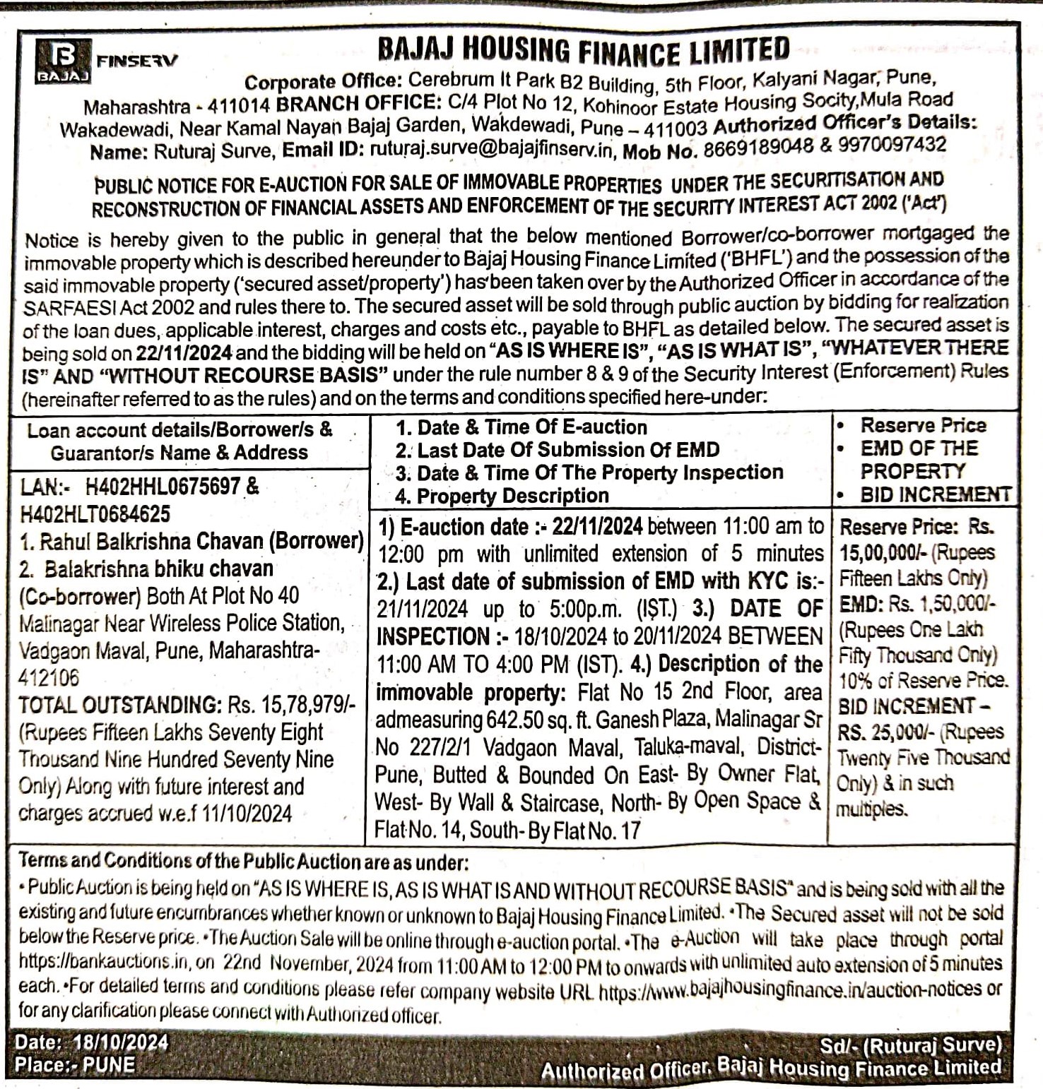 | Schedule of Property: | Flat No 15 2nd Floor, area admeasuring 642.50 sq. ft. Ganesh Plaza, Malinagar Sr No 227/2/1 Vadgaon Maval, Taluka-Maval, District- Pune, Butted & Bounded On East- By Owner Flat, West- By Wall & Staircase, North- By Open Space & Flat No 14, South- By Flat No 17 |
