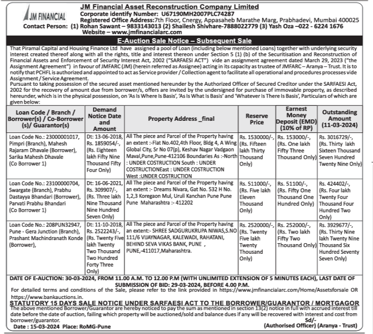 | Contact Details: | Contact The Authorized Officer: Rohan Sawant Ph No: 9833143013, Shailesh Shivhare Ph No: 7888022779, Yash Oza Ph No: 022-62241676 |