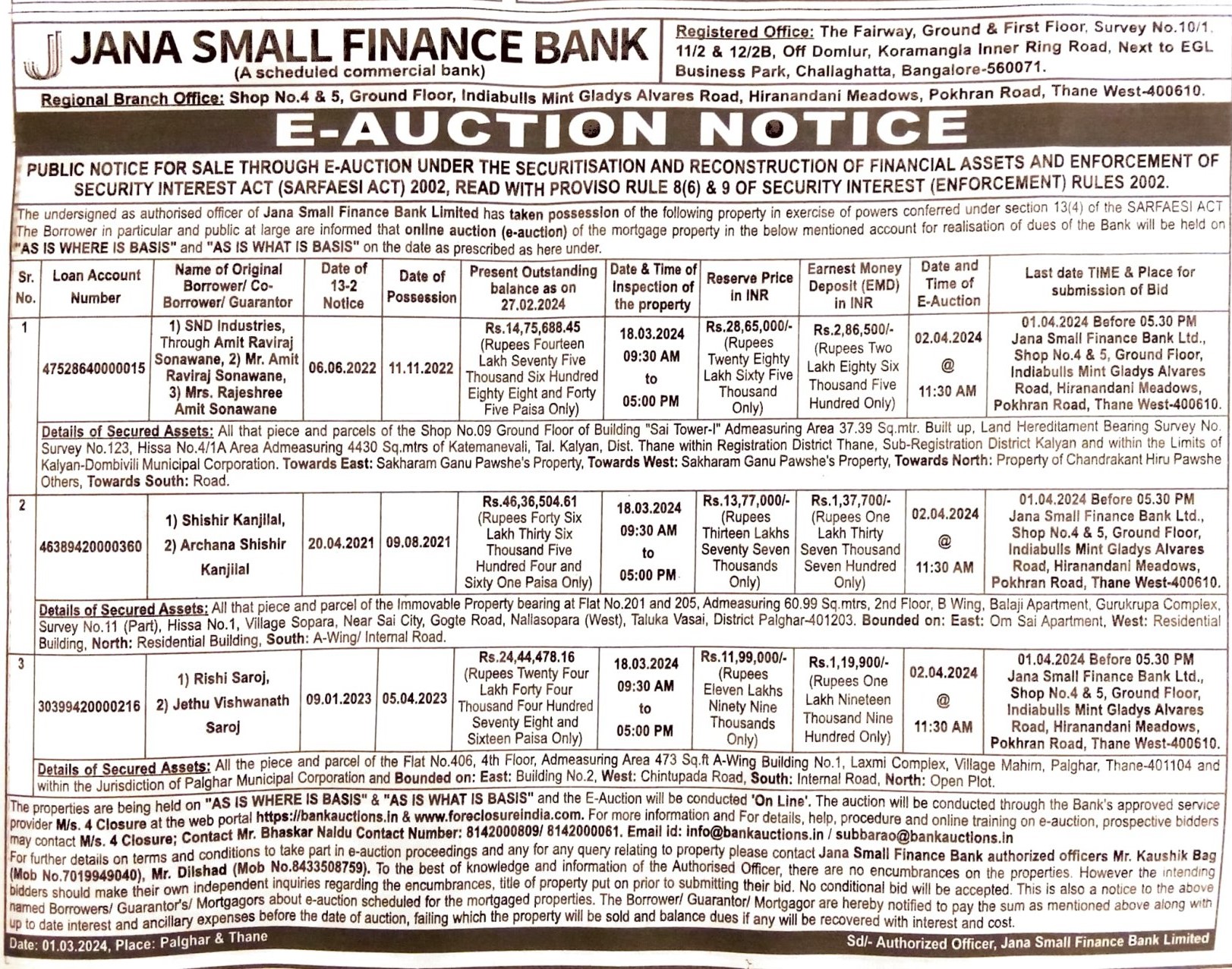 | Contact Details: | Contact Authorized Officer : Mr. Kaushik Bag Mob.no.:7019949040, Mr. Dilshad Mob.No.:8433508759 Mrs. Syeda (Mob No.7400445147). |