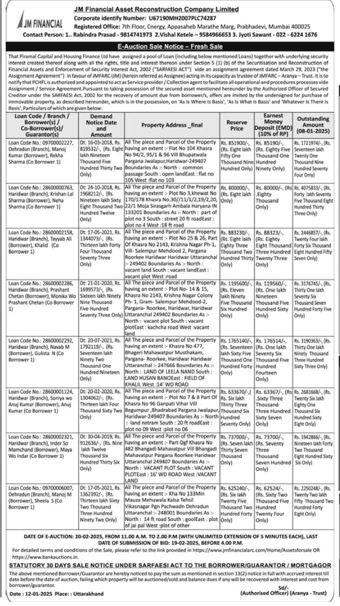 | Schedule of Property: | All The piece and Parcel of the Property having an extent Flat No 104 Khasra No 94/2, 95/1 & 96 Vill Bhupatwala Pargana Jwalapur, Haridwar-249407 Boundaries As: North: common passage South: open land East: flat no 105 West :flat no 103 |