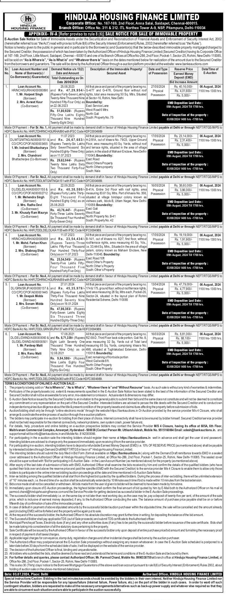 | Start Date and Time of Auction: | 06-08-2024 11:00 am |