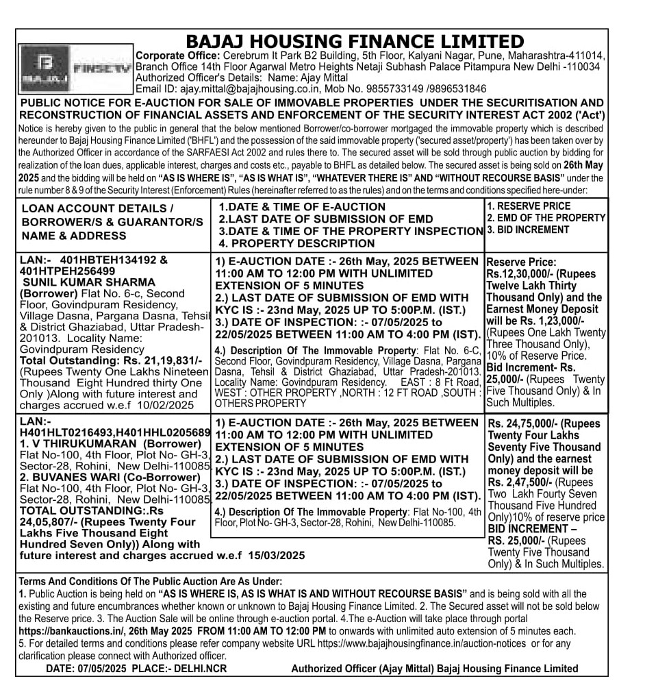 | Contact Details: | Contact The Authorized Officer: Ajay Mittal - 9855733149, 9896531846, Email ID: ajay.mittal@bajajhousing.co.in |