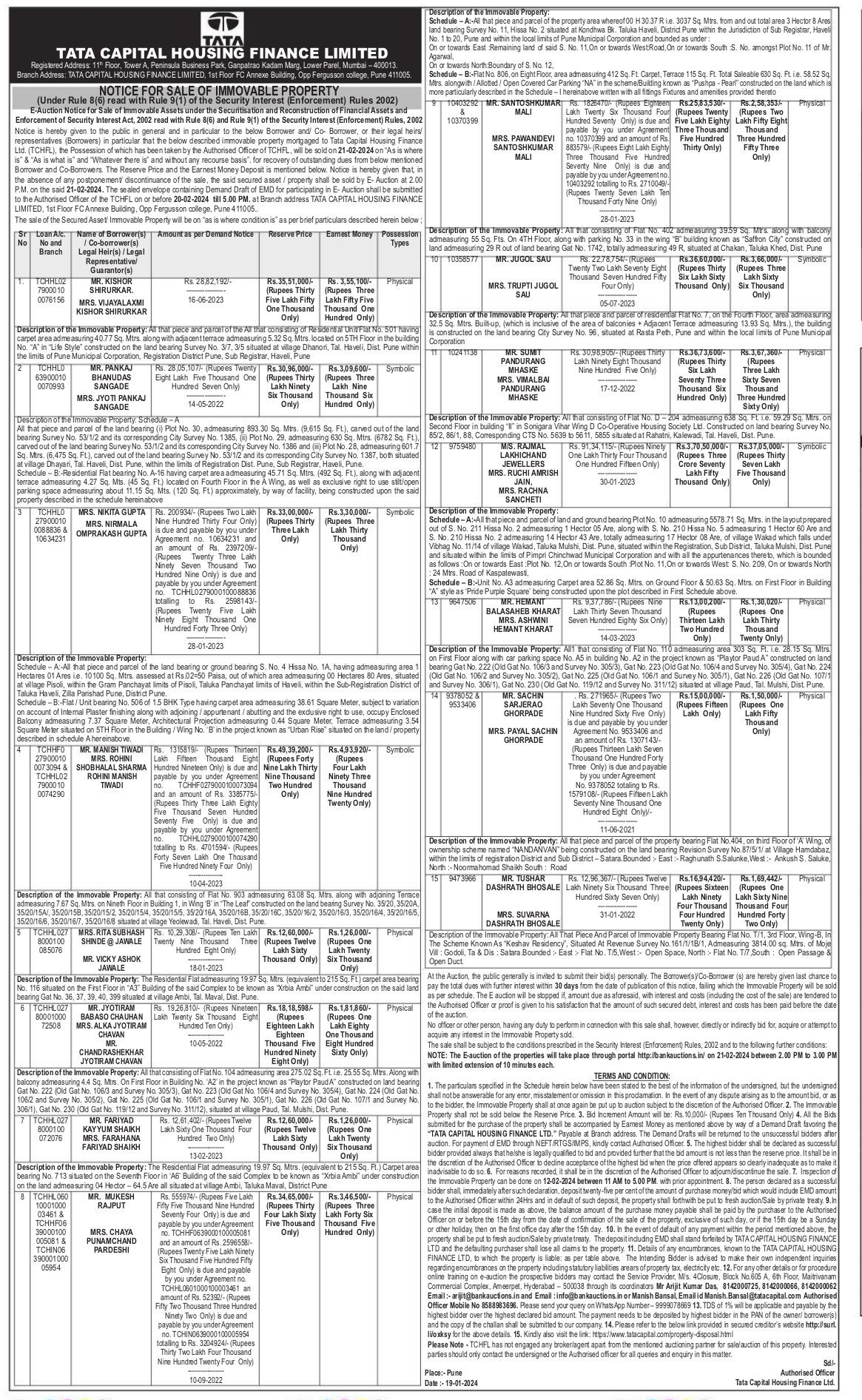 | Contact Details: | Contact The Authorized Officer : Mr. Manish Bansal, Email id Manish.Bansal@tatacapital.com Mobile No 8588983696, 9999078669 |