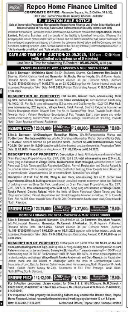 | End Date and Time of Auction: | 23-05-2025 12:00 pm |