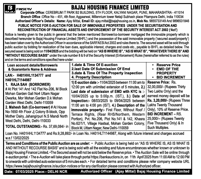 | Contact Details: | Contact the Authorized Officer : Ajay Mittal 9855733149 , 9896531846 |