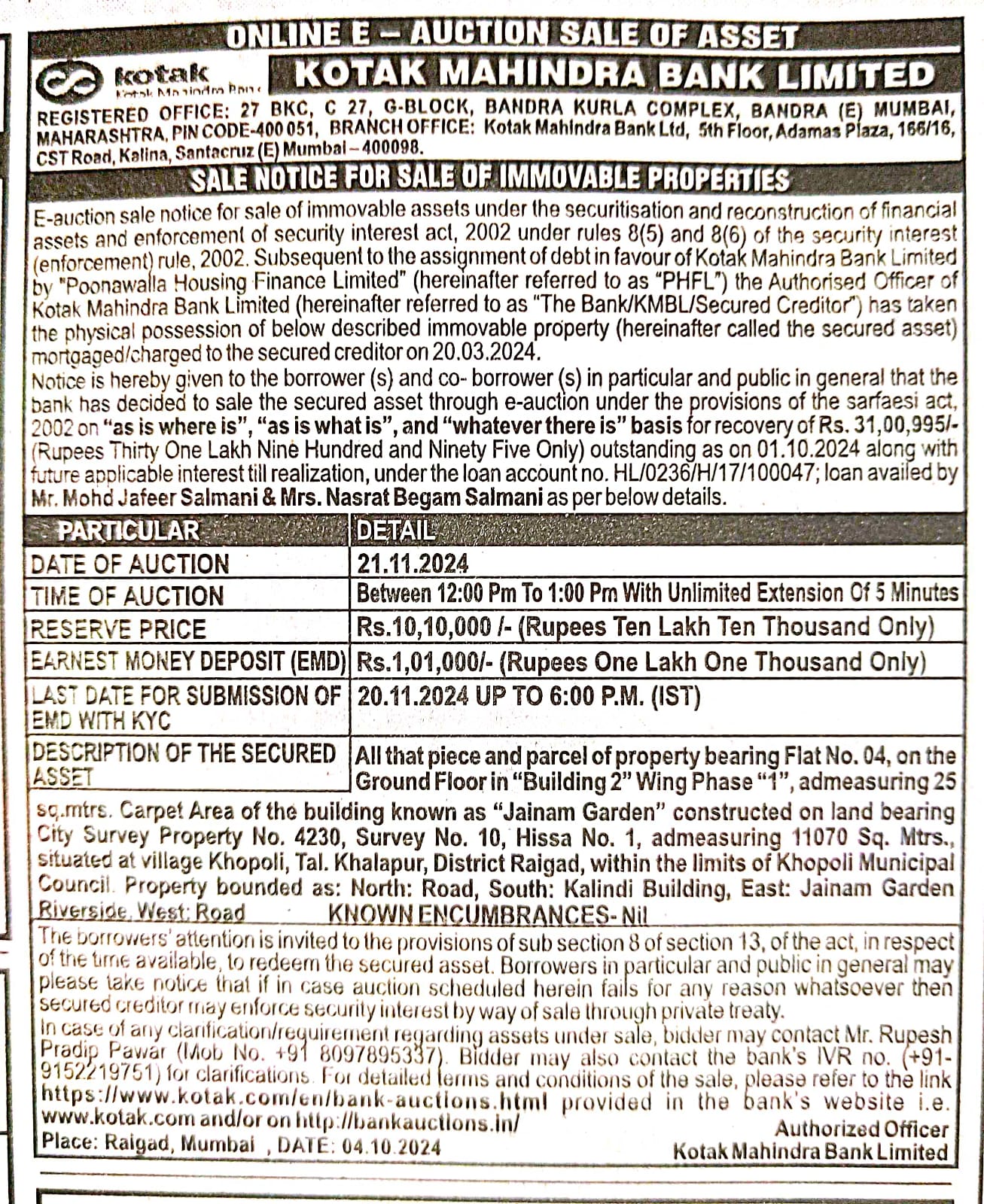 | Schedule of Property: | All that piece and parcel of property bearing Flat No. 04, on the Ground Floor in Building 2 Wing Phase 1, admeasuring 25 sq.mtrs. Carpet Area of the building known as Jainam Garden constructed on land bearing City Survey Property No. 4230, Survey No. 10, Hissa No. 1, admeasuring 11070 Sq. Mtrs., situated at village Khopoli, Tal. Khalapur, District Raigad, within the limits of Khopoli Municipal Council Property bounded as: North: Road, South: Kalindi Building, East: Jainam Garden Riverside West: Road |