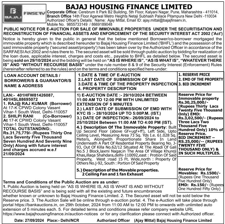 | Contact Details: | Contact The Authorized Officer : Ajay Mittal, Email ID: ajay.mittal@bajajfinserv.in, Mobile No. 9855733149 /8669189048 |