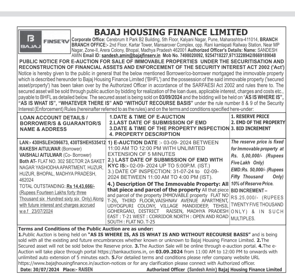 | Contact Details: | Contact The Authorized Officer: Email ID: sandesh.amin@bajajfinserv.in Mob No. 7498020092, 19254718227,9713228942/8669189048 |