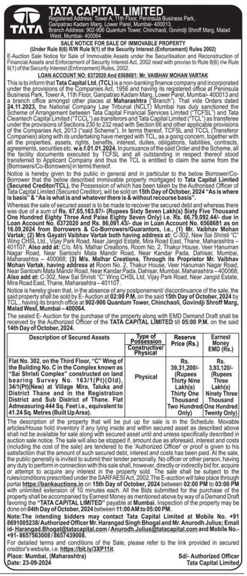 | Schedule of Property: | Flat No. 302, on the Third Floor, C Wing of the Building No. C in the Complex known as Sai Shristi Complex constructed on land bearing Survey No. 163/1(Pt)(Old), 34/1(Pt)(New) at Village Mira, Taluka and District Thane and in the Registration District and Sub District of Thane. Flat Admeasuring 444 Sq. Feet i.e., equivalent to 41.24 Sq. Metres (Built Up Area). |