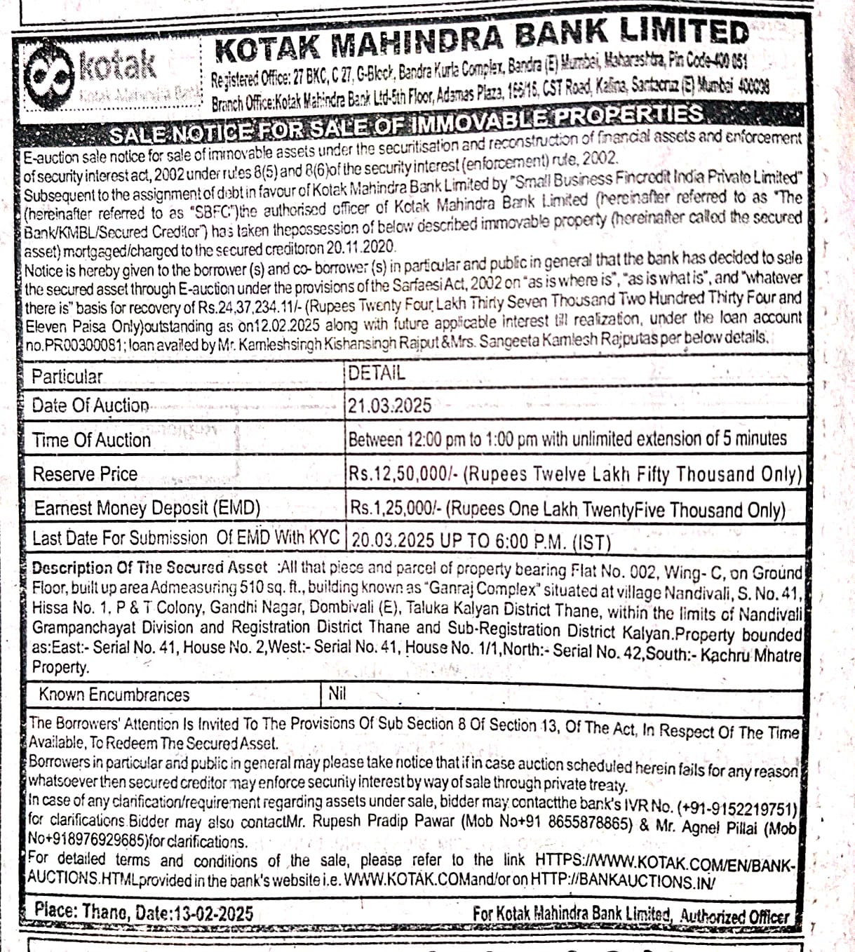 | Contact Details: | Contact The Authorized Officer : Mr. Rupesh Pradip Pawar 8655878865, Mr. Agnel Pillai 8976929685 |