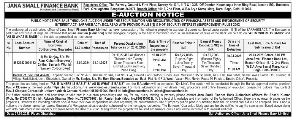 | Schedule of Property: | Details of Secured Assets: Property bearing Plot No.A-79 Khasra No 348. Flat No GF-4, Ground Floor (Without Roof), Area (Land) Measuring 35 Sq.yards, RHS Flat, Rail Vihar, Sarkari Awas Samiti Ltd., situated at Village Sadullabad, Loni, Ghaziabad. Owned by Mr Sanjay, S\u002Fo Mr Ram Kishan |