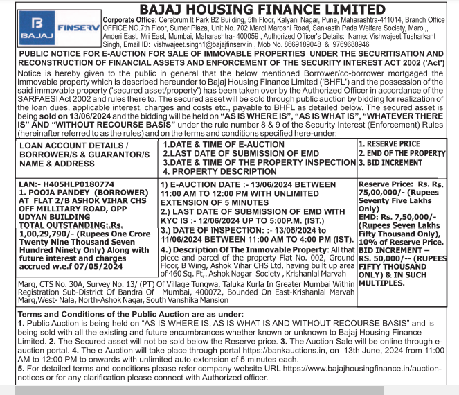 | Schedule of Property: | All that piece and parcel of the property being Flat No. 002, Ground Floor, B Wing, Ashok Vihar CHS Ltd, having built up area of 460 Sq. Ft,. Ashok Nagar Society , Krishanlal Marvah Marg, CTS No. 30A, Survey No. 13/ (PT) Of Village Tungwa , Taluka Kurla In Greater Mumbai Within Registration Sub-District Of Bandra Of Mumbai, 400072, Bounded On East-Krishanlal Marvah Marg,West- Nala, North-Ashok Nagar, South Vanshika Mansion |