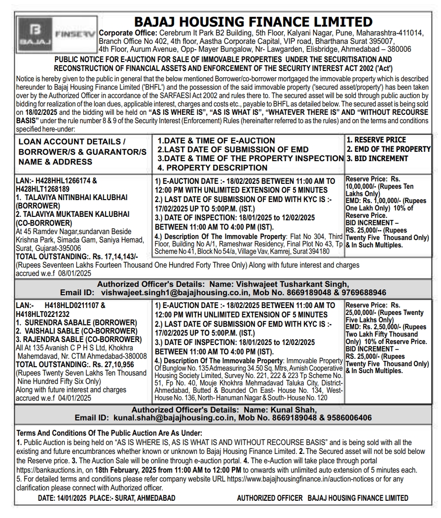 | Contact Details: | Contact The Authorized Officer : Name: Vishwajeet Tusharkant Singh, Email ID: vishwajeet.singh1@bajajhousing.co.in, Mob No. 8669189048 & 9769688946 |