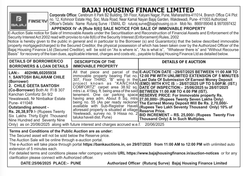 | Schedule of Property: | All that piece and parcel of the immovable property bearing Flat no. 307, Floor THIRD, "B" wing in the project known as "KANCHAN COMFORTZ" carpet area 38.92 sq. mtrs i.e. 419sq. ft. being area of the said tenement. One car parking space having area adm. About 8 Sq. mtrs being no. 55 (As per ready reckoner available with Sub-Registrar Haveli aforesaid property is situated at villageYewlewadi, survey no. 9 Hissa no. 2 taluka haveli dist. Pune) |