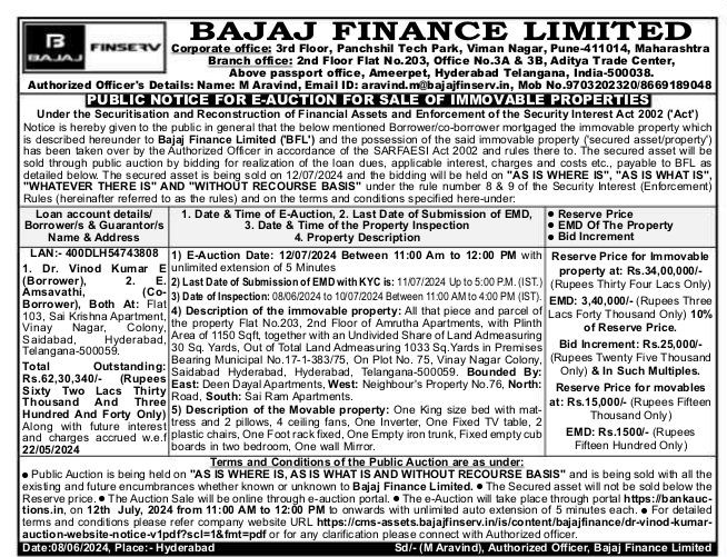 | Contact Details: | Contact The Authorized Officer : Name: M Aravind, Email ID: aravind.m@bajajfinserv.in,Mob No.9703202320/8669189048 |
