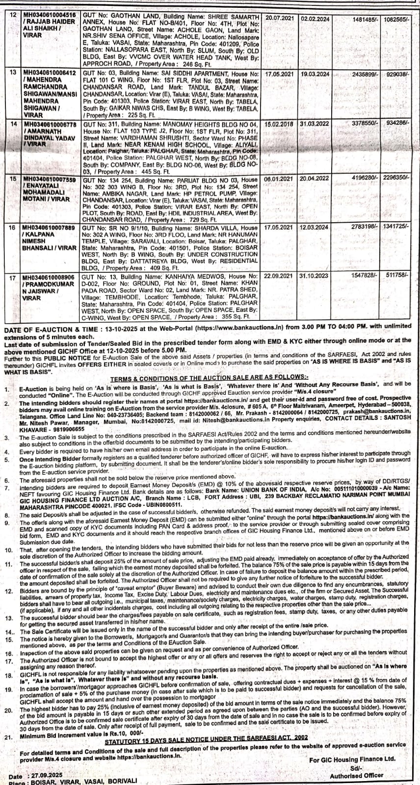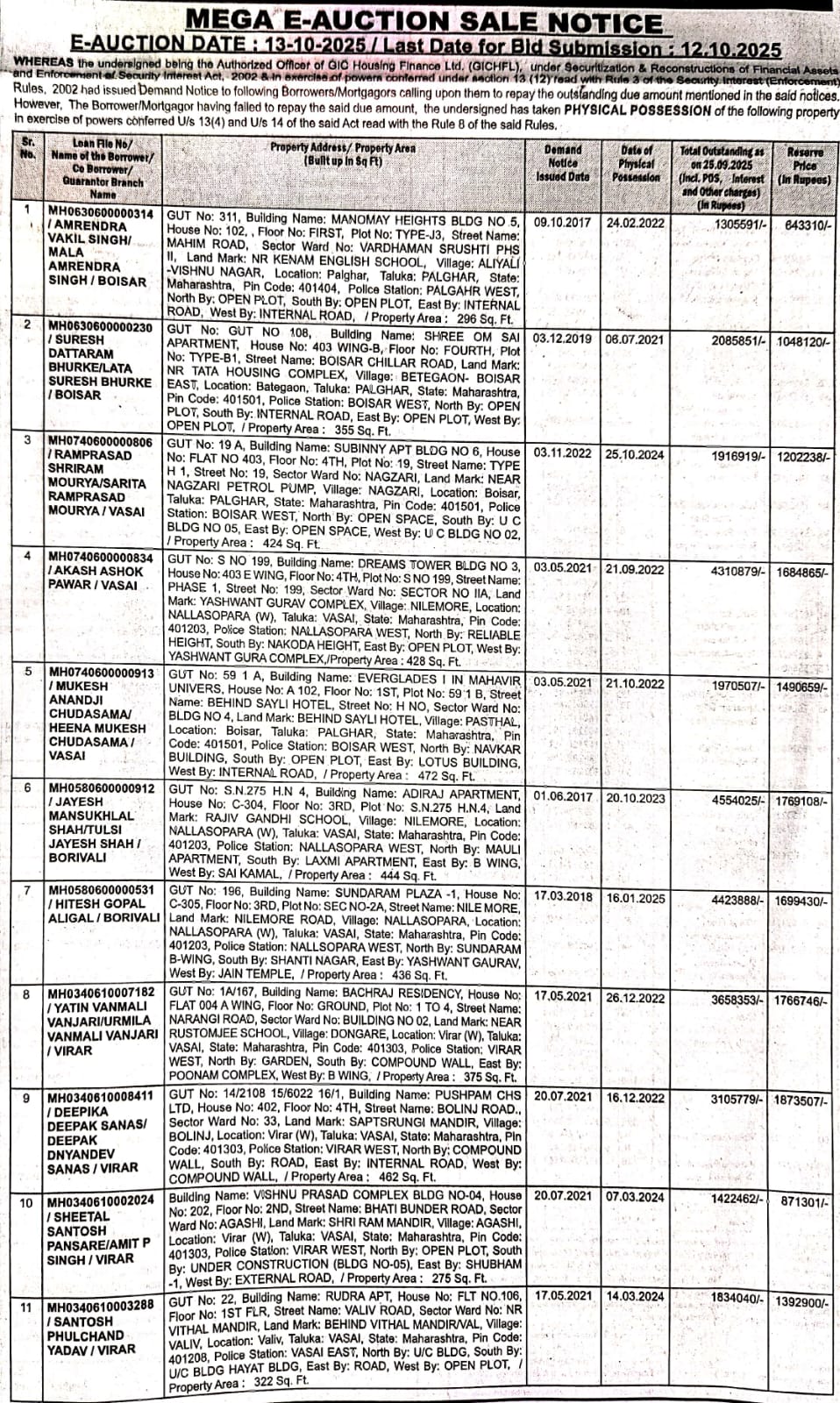 | Inspection Details: | For Inspection Contact The Authorized Officer : Branch Mail: virar@gichfindia.com Tel No- 022-43041900 |