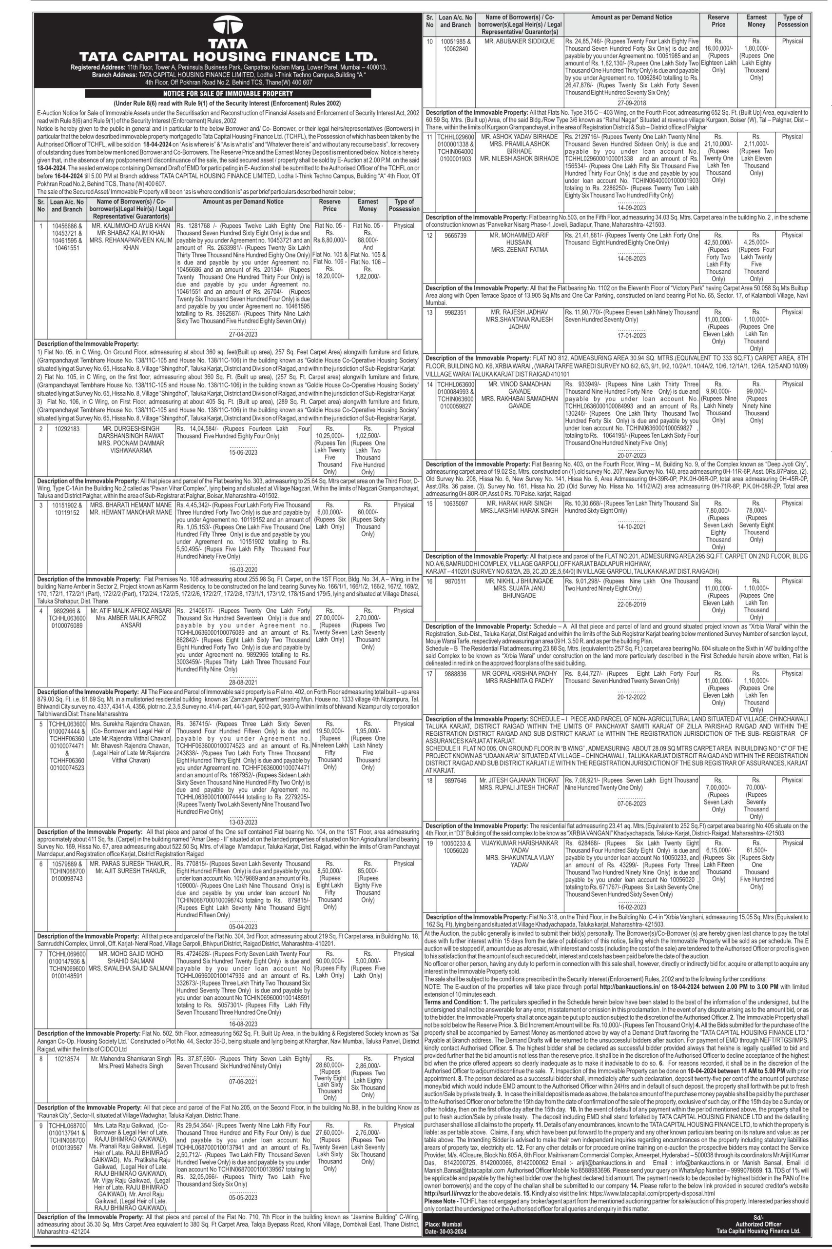 | Contact Details: | Contact Authorized Officer :Kiran Nikam Mob.No.:9422663844, Sunil Sharma Mob.No.:9960796000 , Manish Bansal Mob.No.:8588983696 , 9999078669 |