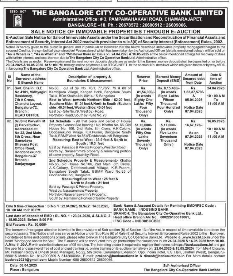 | Schedule of Property: | 1st Schedule: All that piece and parcel of House Property/vacant Site bearing: No. Khatha No. 66, Old House No. 106, 2nd Main, 8th Cross, A.K.Colony, Doddanekundi Village, K.R.Puram, Bangalore South Taluk, BBMP Ward No.85 of Doddanekkundi, Bangalore. Measuring: East to West: 33.9 feet & North to South: 16.3 feet East by: Passage & Private Property, West by: Road, North by: Narasamma's property & remaining portion of same property. South by: Road. 2nd Schedule Property & Measurement:- Khatha No.66, old House No. 106, 2nd Main, 8th Cross. A.K.Colony, Doddanekundi Village, K.R.Puram, Bangalore South Taluk, BBMP Ward No.85 of Doddanekkundi, Bangalore. Measuring: East to West: 25 feet & North to South: 21 feet East by: Passage & Private Property, West by: Narasamma's Property, North by: Narayanaswamy's Property. South by: Remaining Portion of Same Property |